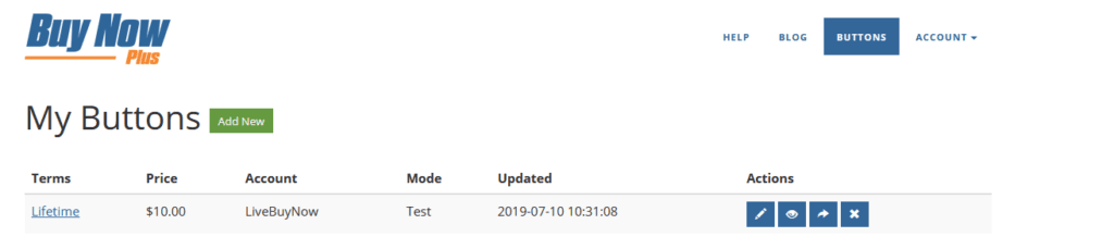 Once you login to Buy Now Plus, you will be taken to your “Buttons” page. If not you can simply choose “Buttons” from your menu. Then choose the “create your first button” link.