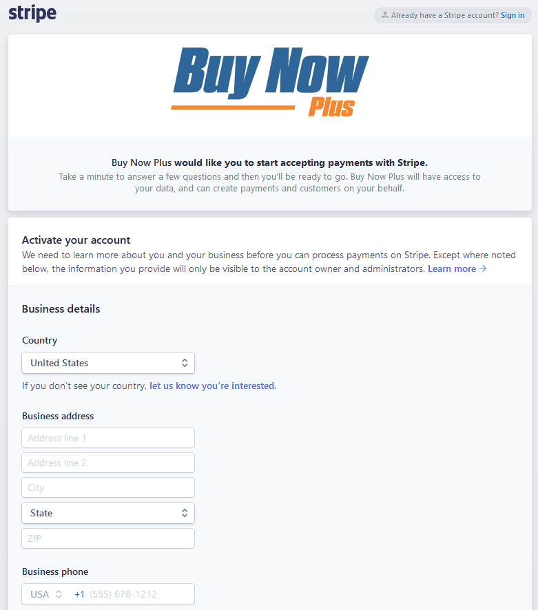 Fill out the form on the next page – OR – if you already have a Stripe account click the “Sign in” link at the top right side of the page.