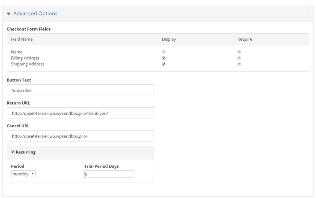 Then simply fill out the details of your Membership, terms, pricing etc.. then choose which account you want to tie it to in the “Stripe Account” drop down. Then click on the “Advanced Options”